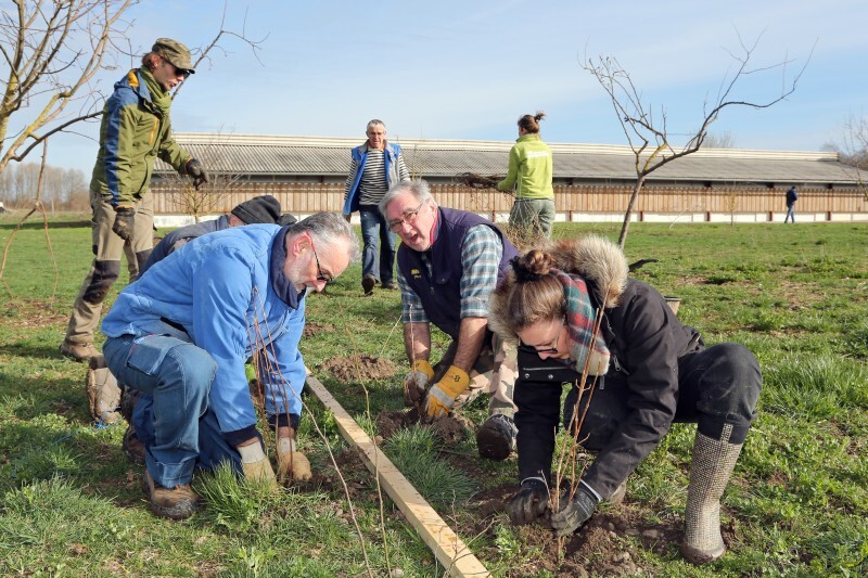 Une quinzaine de personnes s’affaire sur la parcelle de Kevin Goetz. Le 12 mars, l’éleveur bio de Witternheim a invité famille et amis à une journée un peu spéciale. Ils vont planter des haies entre le bâtiment d’élevage de poulets et l’étable. Cent mètres de terrain vague transformés en mini-forêt. « On va poser environ 2 000 plants », renseigne le jeune agriculteur, tarière à la main et gouttes de sueur sur le front.