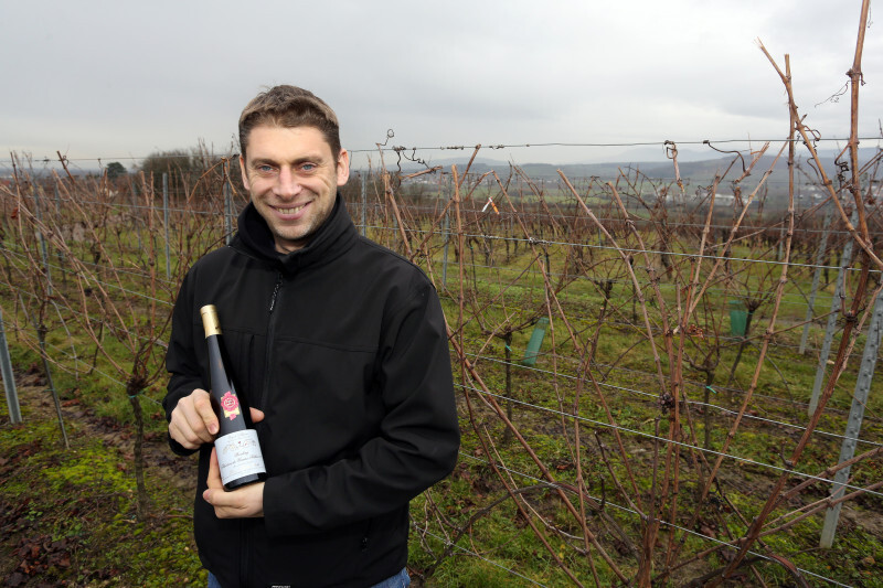 LE TERROIR. Encore un peu et Frédéric Becht qualifierait de quelconque cette parcelle de 40 ares au pied du lieu-dit Stierkopf, à 230 m d’altitude ! Il faut dire qu’elle est plate et donc sans exposition particulière. Offerte au passage des vents, sa richesse se cache dans un sol plutôt lourd, retenant assez bien l’eau, mêlant du limon dans ses premiers centimètres à de la marne bleue en profondeur. L’été, sous l’effet du soleil, des crevasses de surface se forment.
