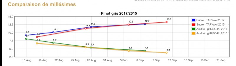 Démarrées avec un potentiel d’acidité supérieur à 2015, et assez remarquable au regard de la précocité, les courbes d’accumulation des sucres et de baisse d’acidité ressemblent désormais au millésime 2015, tant pour les pinots gris que pour les rieslings. Ou même pour les pinots noirs et blancs. Cependant, comparé à 2015, les pH s’affichent à des niveaux bien bas, à l’exception de quelques gewurztraminers dans certaines communes. Ce qui laisse désormais un peu de temps pour vendanger les raisins à vins tranquilles, sauf risques sanitaires de fin de cycle.