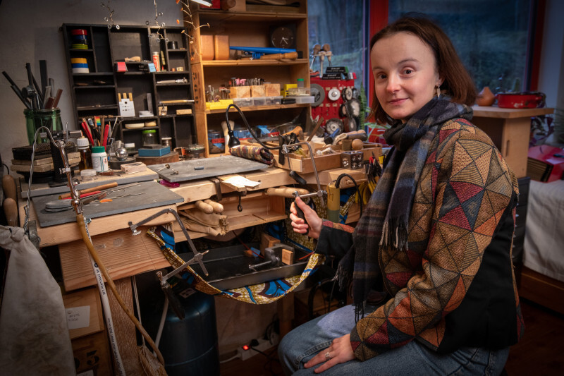 Scie, marteaux, pinces, meulettes, bouterolle, triboulet… Sur l’établi d’Élisa Klur, à peine plus grand qu’un bureau ordinaire, toute la panoplie des outils du bijoutier est réunie, rangée famille par famille.