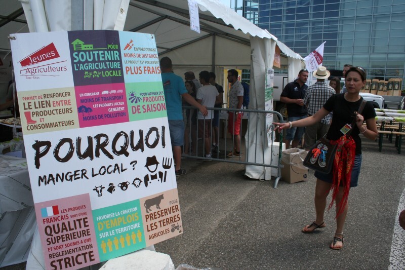 « Pourquoi manger local ? » À l’entrée de la tente tenue par les Jeunes Agriculteurs du Bas-Rhin, un panneau énumère huit raisons qui plaident pour une alimentation de proximité. Consommer des produits frais et de saison, soumis à de strictes règles de production, favoriser le lien entre producteurs et consommateurs, générer moins de transport, donc moins de pollution, sont quelques-uns des arguments mis en avant.